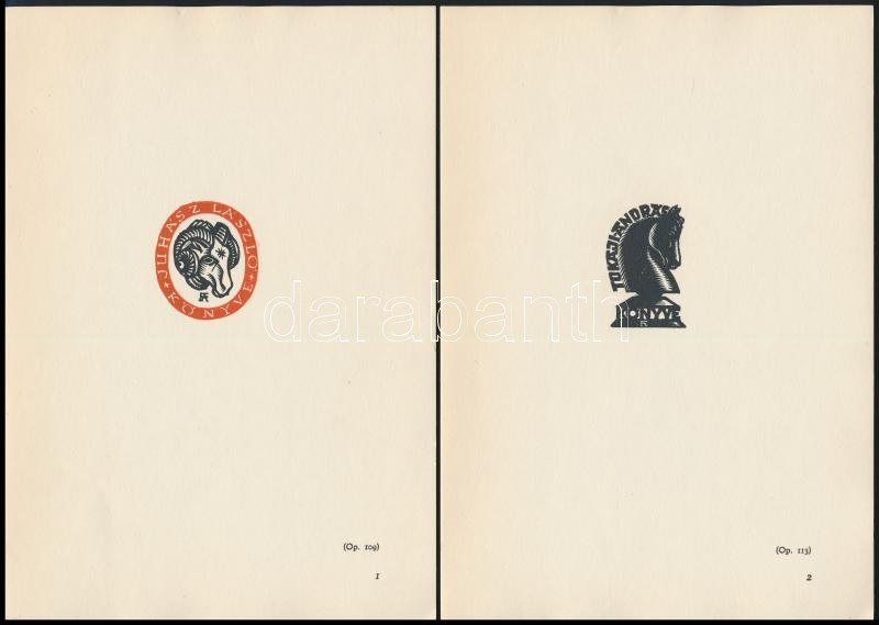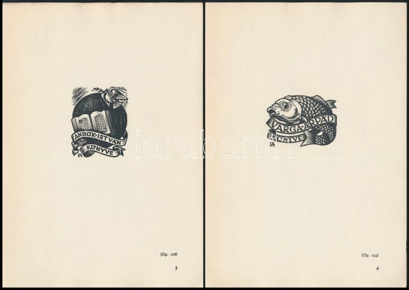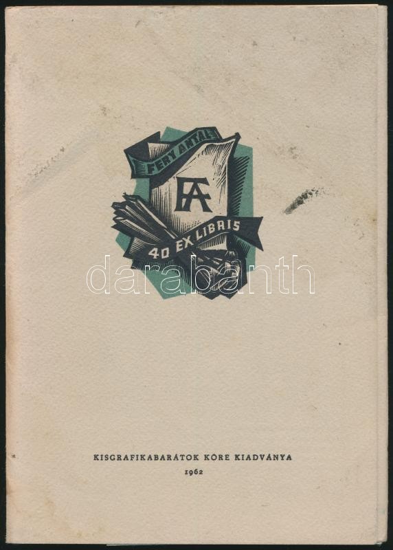 1962 Fery Antal 40 ex libris. Bp., 1962, Kisgrafikabarátok Köre Kiadványa, (Ságvári Endre Nyomdaipari Tanulóintézet-ny.), 6+40 t.(ex libris-szek.) Kiadói papírmappában, foltos mappával. Fery Antal fametszeteivel, annak részletes, számozott, időrendbe szedett listájával, Galambos Ferenc utószavával. Számozott (500/15.) példány. A művész, Fery Antal (1908-1994) által Gaár Vilmos (1862-1963) részére dedikált példány, dátumozva (Bp.,1962.III.7.)