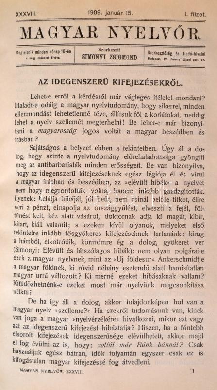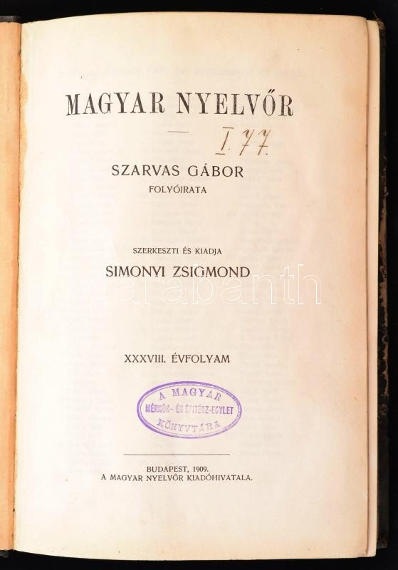 1909 Magyar nyelvőr. XXXVIII. évfolyam. Szarvas Gábor folyóirata. Szer... https://www.darabanth.com/hu/328-Gyorsarveres/328.0/Festmeny-mutargy-papirregiseg-egyeb/Nyomtatvanyok~1000030/1909-Magyar-nyelvor-XXXVIII-evfolyam-Szarvas-Gabor-folyoirata-Szerk-Simonyi-Zsigmond-Bp-~II1831567