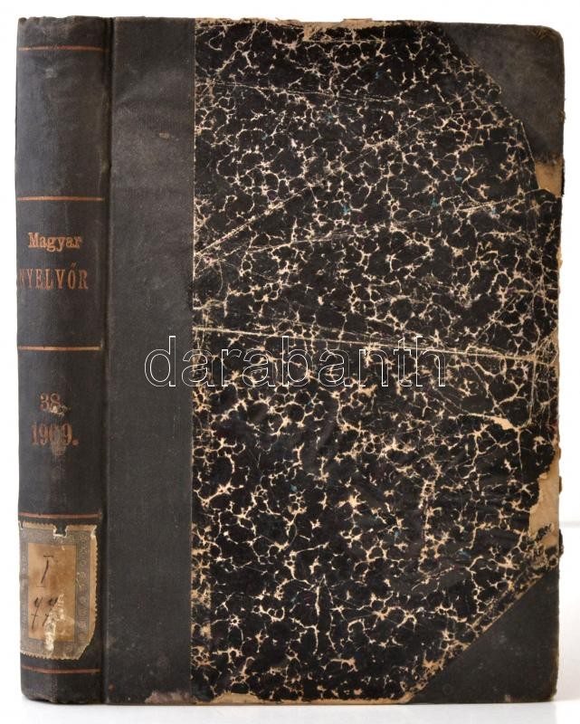 Leírás: 1909 Magyar nyelvőr. XXXVIII. évfolyam. Szarvas Gábor folyóirata. Szerk.: Simonyi Zsigmond. Bp.,1909, Magyar Nyelvőr. 2+480 p. Átkötött kopott félvászon-kötés, márványozott lapélekkel, intézményi bélyegzővel.