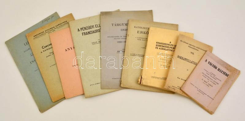 1912-1950 Vegyes nyomtatvány tétel, 10 db: Katolikus keresztény erkölcstan, A kereskedelmi levelek, kereskedelmi könyvek, és ajánlatok illetéke, Tárgymutató a költségvetési és indemnitási törvényekben felvett idegen szakaszokhoz, Anyák jogai, CsecsemÅ‘tápszerek a hétköznapi gyakorlatban, A váltók illetéke, Rokkantellátási adó, Leltári utasÃtás az állami gimnáziumok és reáliskolák...ingó vagyonának kezelésére és elszámolására. Különféle kiadásban, változó állapotban.