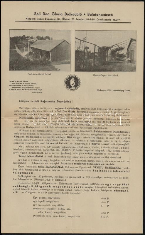 1933 Bp., A Soli Deo Gloria Diáküdülő Balatonszárszó javára való gyűjt... https://www.darabanth.com/hu/328-Gyorsarveres/328.0/Festmeny-mutargy-papirregiseg-egyeb/Nyomtatvanyok~1000030/1933-Bp-A-Soli-Deo-Gloria-Diakudulo-Balatonszarszo-javara-valo-gyujtesrol-szolo-leve~II1828685