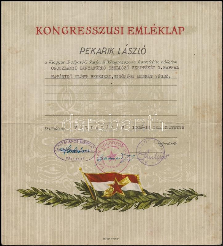 1954 Kongresszusi felajánlási emléklap https://www.darabanth.com/hu/328-Gyorsarveres/328.0/Festmeny-mutargy-papirregiseg-egyeb/Okmanyok~1000017/1954-Kongresszusi-felajanlasi-emleklap~II1829836