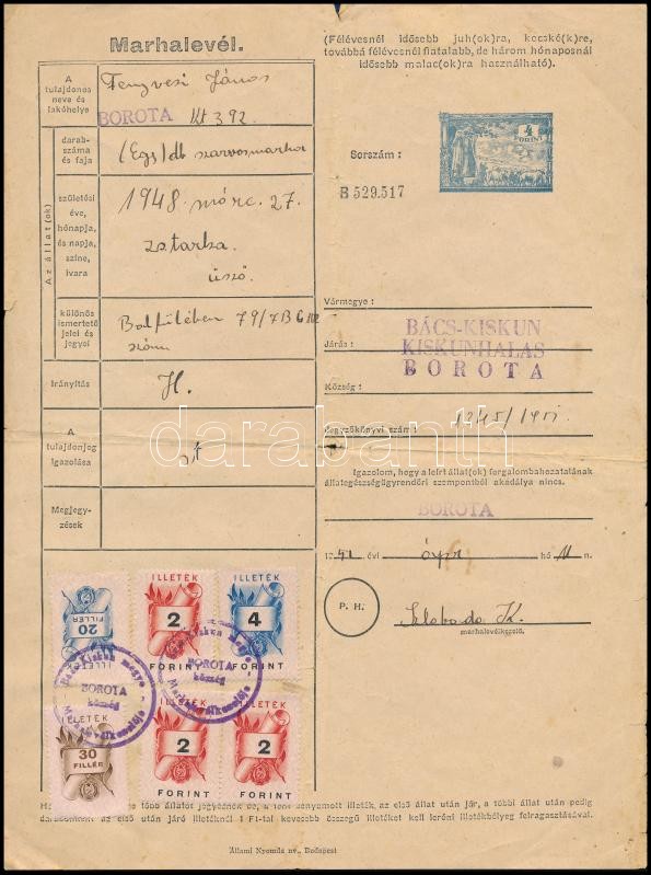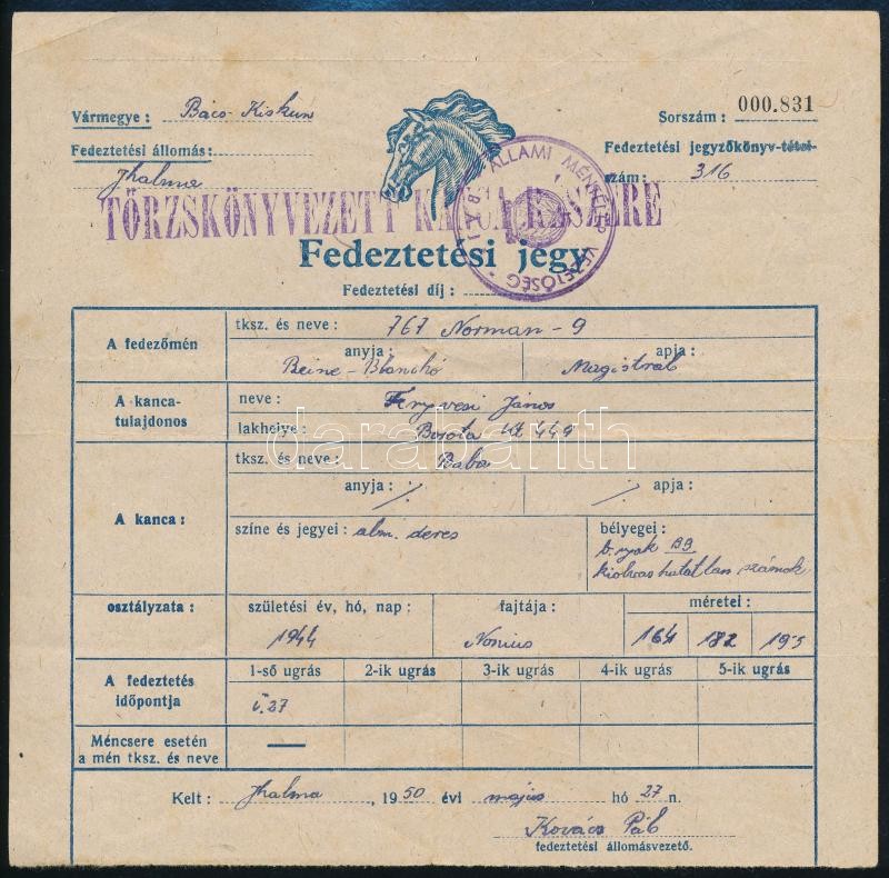 Leírás: 2 db marhalevél és 1 db fedeztetési jegy okmánybélyegekkel