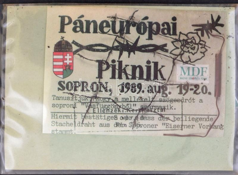 Leírás: 1989 Sopron, darab a vasfüggönyből, a Páneurópai piknik tanúsítványával