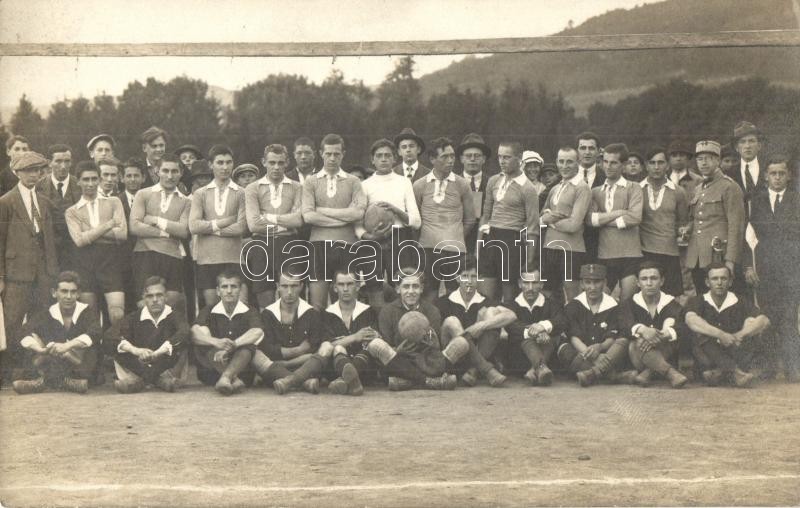 1922 Dicsőszentmárton, Tarnaveni, Diciosanmartin; MSE (?) a Dacia focicsapat ellen, hátoldalon a sportolók nevei és az eredmény / MSE vs. Dacia football match, group picture with the teams, football players' names and final score on the backside. photo