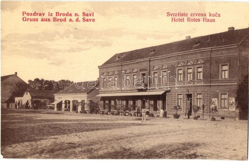 Bród, Nagyrév, Slavonski Brod, Brod na Savi; Vörös Ház Szálloda, C. Bencevic és Milan Petrovacki üzlete. W.L. 138. / Svratiste crvena kuca / Hotel Rotes Haus, shops,