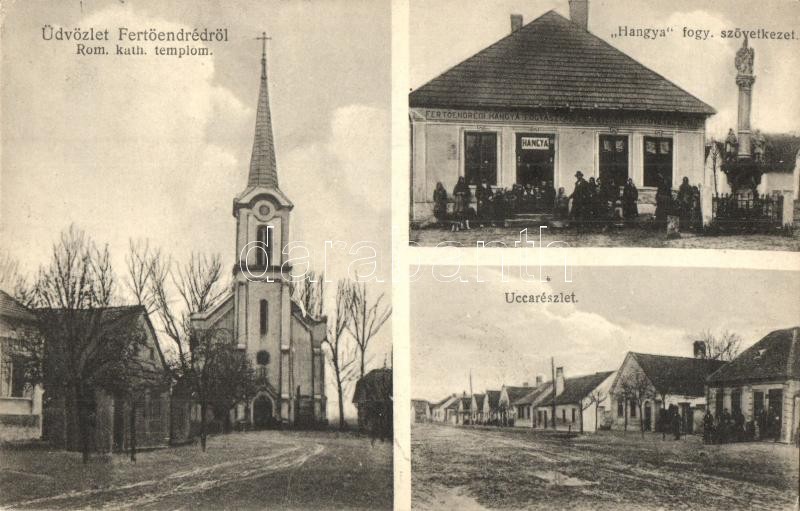 Leírás: 1928 Fertőendréd, Római katolikus templom, utca, Hangya fogyasztási szövetkezet üzlete és saját kiadása