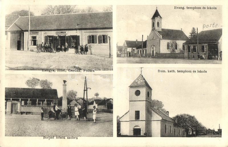 Borjád, Evangélikus templom és iskola, Római katolikus templom és iskola, Hősök szobra, Hangya fogyasztási szövetkezet üzlete, O.K.H. Hitelszövetkezet, Gazdák Biztosítási szövetkezete, Futura gabona bevásárlási telep