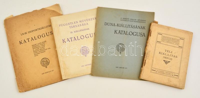 1909-1933 Kiállítási katalógus tétel, 4 db: 1909-1910 Országos Magyar Képzőművészeti Társulat Téli Kiállítás. 1909-1910. Bp.,1909,Singer és Wolfner, (Hornyánszky-ny.)88 p.+24 t. Fekete-fehér fotókkal illusztrált. Kiadói papírkötésben, megviselt állapotban, az elülső borítója és a gerince hiányzik. 1928. A LX-ik csoportkiállítás katalógusa. A Nemzeti Szalon 392. kiállítása. 1928. március. Bp.,1928, Vészi-nyomda, 16 p.+ 17 t. Kiadói papírkötés, sérült, hiányos papírborítóval, egy illusztráció kijár, egy illusztrációt kivágtak. Benne Bálint Rezső, Bolmányi Ferenc, Boromisza Tibor, Ifj. Gaár Vilmos, Káplár Miklós, vitéz Leidenfrost Pál, Pogány Ferenc műveiről készült fekete-fehér illusztrációkkal. 1930. A Nemzeti Szalon művészeti egyesület első representativ Duna-kiállításának katalogusa, 16 p. 1930. Független Művészek Társasága III. kiállításának katalogusa. 1930. október. Bp., 1930,(Vészi-ny.) 26 p.+23 t. Kiadói papírkötés.