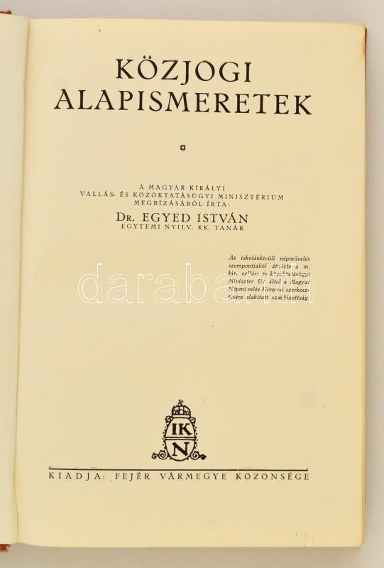 Dr. Egyed István: Közjogi alapismeretek. A magyar népművelés könyvei. Bp.,1927, Fejér Vármegye Közönsége, (Kir. M. Egyetemi Nyomda-ny.), XIII+239+1 p.+14 t.(Fekete-fehér fotók.) Első kiadás. Kiadói egészvászon-kötés, kissé kopott borítóval.