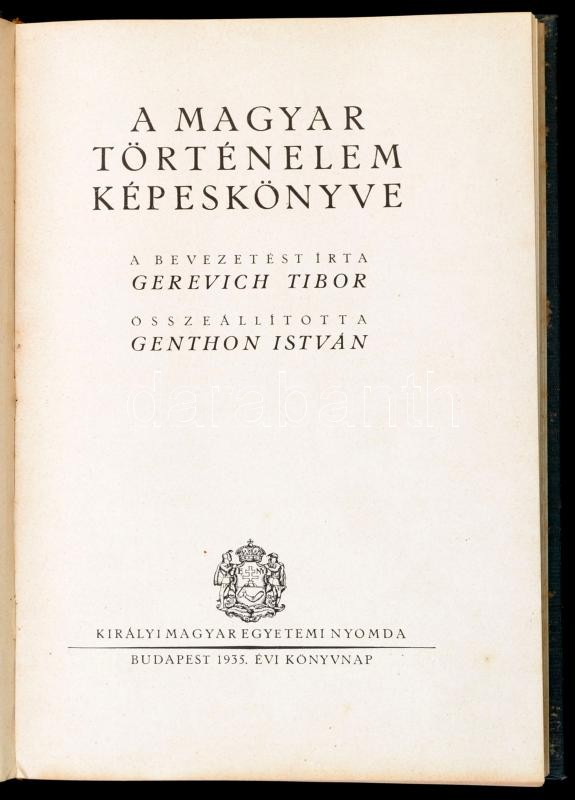 A magyar történelem képeskönyve. Összeállította Genthon István. Bevezetőt írta Gerevich Tibor. Bp., 1935, Kir. Magyar Egyetemi Nyomda, XXXVIII+216 p. Gazdagon illusztrálva. Kiadói aranyozott, dombornyomott egészvászon-kötésben.