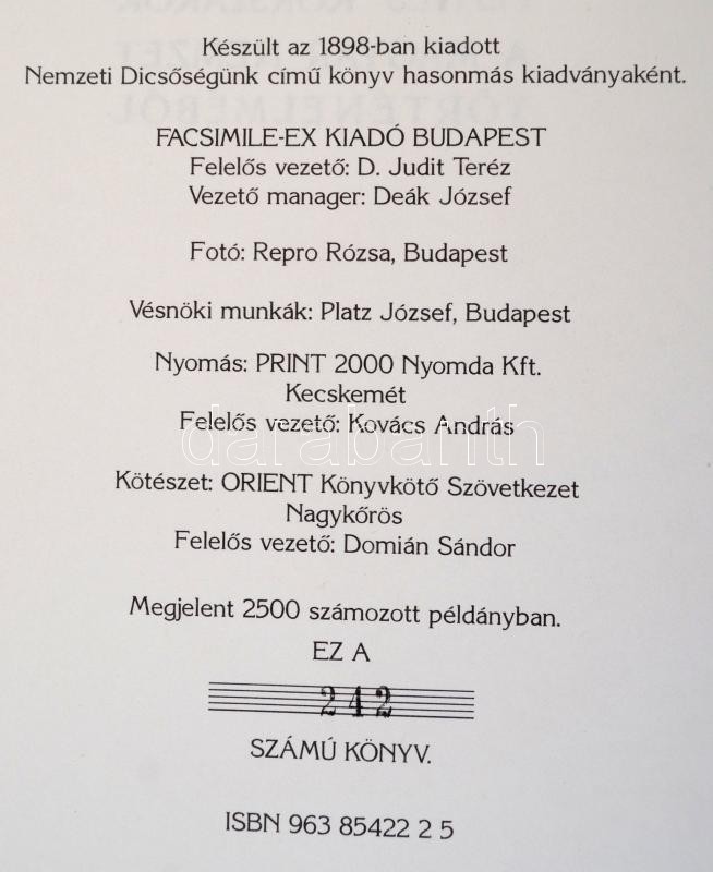 Nemzeti Dicsőségünk. Szerk. Hock János. Budapest, é.n., Facsimile-ex Kiadó. Képekkel gazdagon illusztrált. Kiadói festett, dombornyomott, illusztrált műbőrkötés. Reprint kiadás, 1898-ban kiadott Nemzeti Dicsőségünk c. könyv hasonmás kiadványa. Számozott (2500/242.) példány. Jó állapotban.