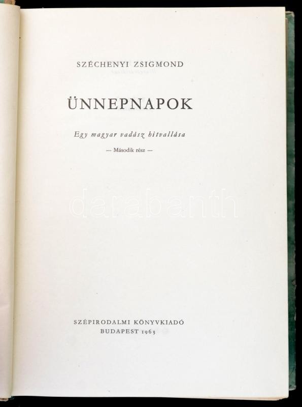 Széchényi Zsigmond: Ünnepnapok. Egy magyar vadász hitvallása. Második rész. Bp., 1963, Szépirodalmi. Első kiadás. Kiadói félvászon-kötés, kissé kopott borítóval, jó állapotban.