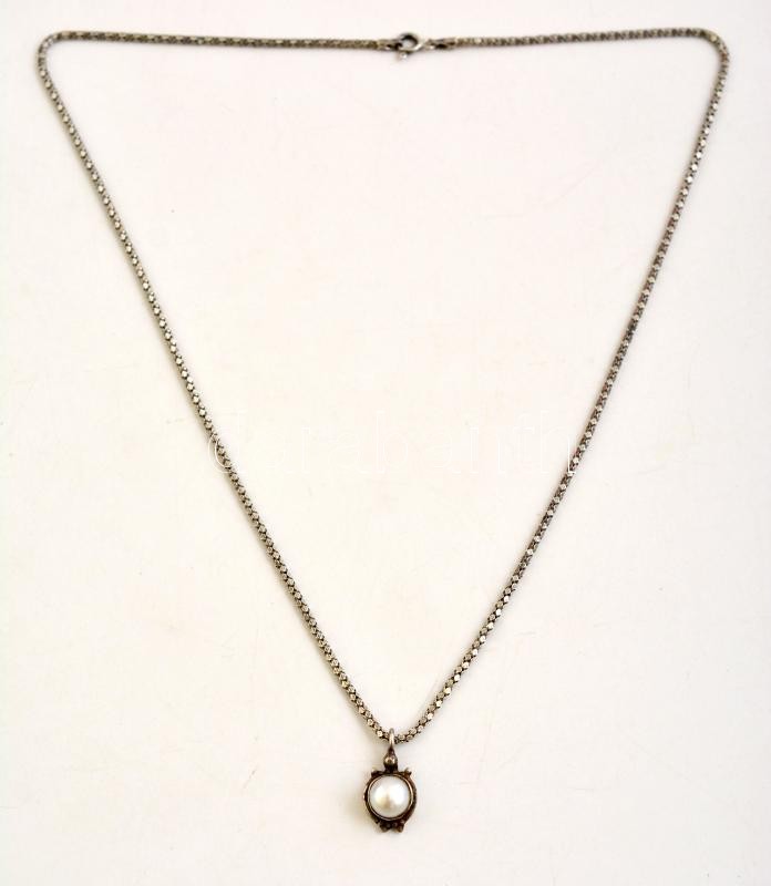 Leírás: Ezüst(Ag) nyaklánc, gyönggyel díszített medállal, jelzett, h: 44 cm, bruttó: 4,2 g