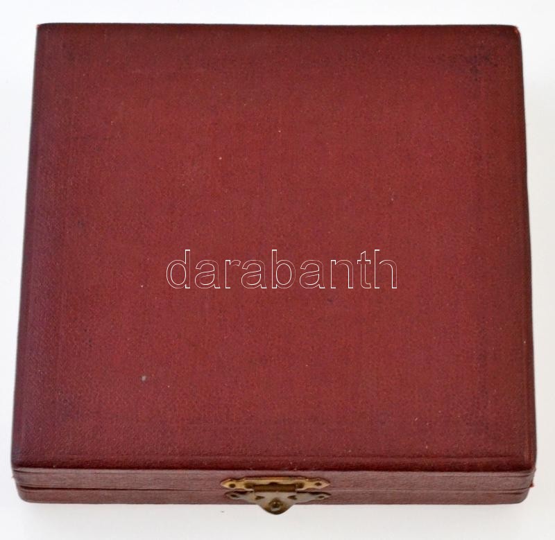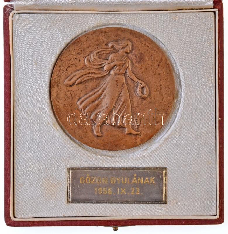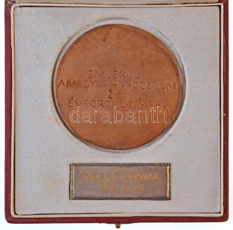 Pátzay Pál (1896-1979) DN "Koszorús nőalak / Emlékül a Magyar Hangosfilm 25. évfordulójára" egyoldalas Br plakett dísztokban, fémből készült névtáblával mellette (70mm)