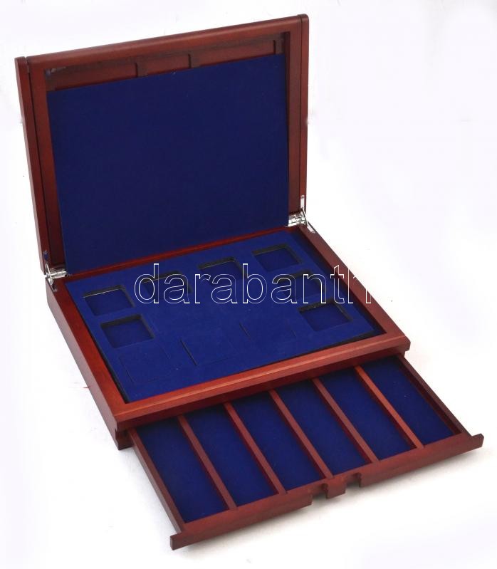 "Die wertvollsten Briefmarken der Welt in reinstem Silber" fa éremtartó doboz bélyegérmek számára, egy tálcával és egy kihúzható kis fiókkal. Nagyon szép állapotban.