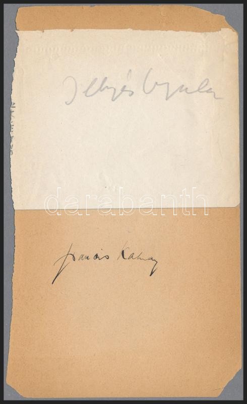 Leírás: Illyés Gyula és Francsi Kálnay (1899-1992) magyar származású amerikai író aláírásai papírlapon, kartonra ragasztva