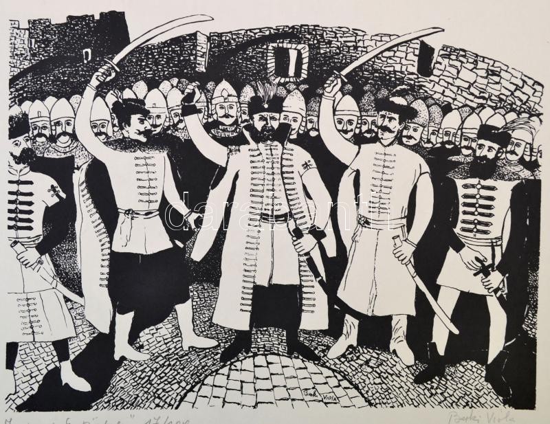 Leírás: Berki Viola (1932-2001): Zrínyi esküje (17/100). Linó, papír, jelzett, 26×34 cm