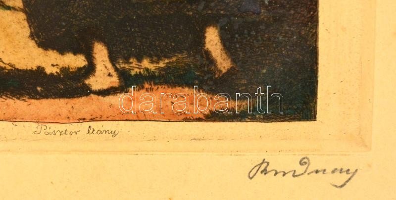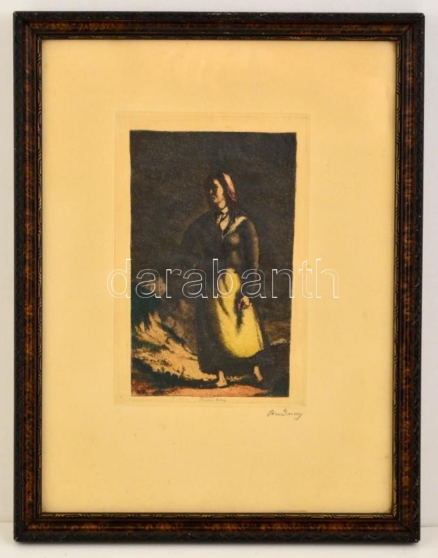 Leírás: Rudnay Gyula (1878-1957): Pásztorleány, színezett rézkarc, papír, jelzett, üvegezett fa keretben, 24×16 cm