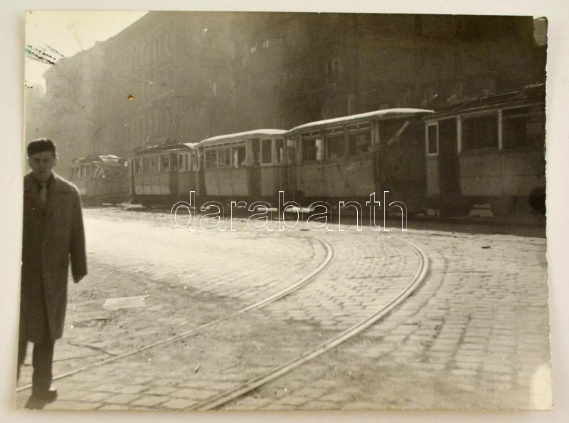 1956 Szétlőtt villamos a pesti utcán . 12x9 cm