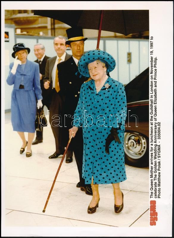 1997 London, II. Erzsébet brit királynő arany házassági évfordulóján tartott fogadáson, SYGMA képügynökség, 20,5x27,5 cm / The Queen Mother arrives for a luncheon to celebrate their Golden Wedding Anniversary, photo Matthew Polak SYGMA, 27,5x20 cm