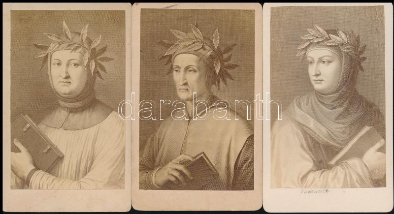 Leírás: cca 1865 Dante, Boccaccio, Petrarca, 3 db fénynyomat, 10×6 cm