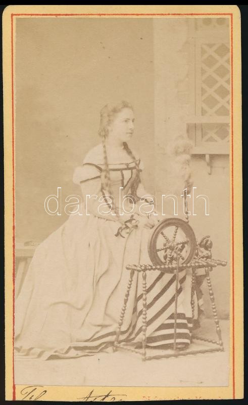 Leírás: cca 1870 "Margit a rokkával", Asten(?) színésznő színpadi szerepben, keményhátú fotó, karton részben levágva,10×6 cm