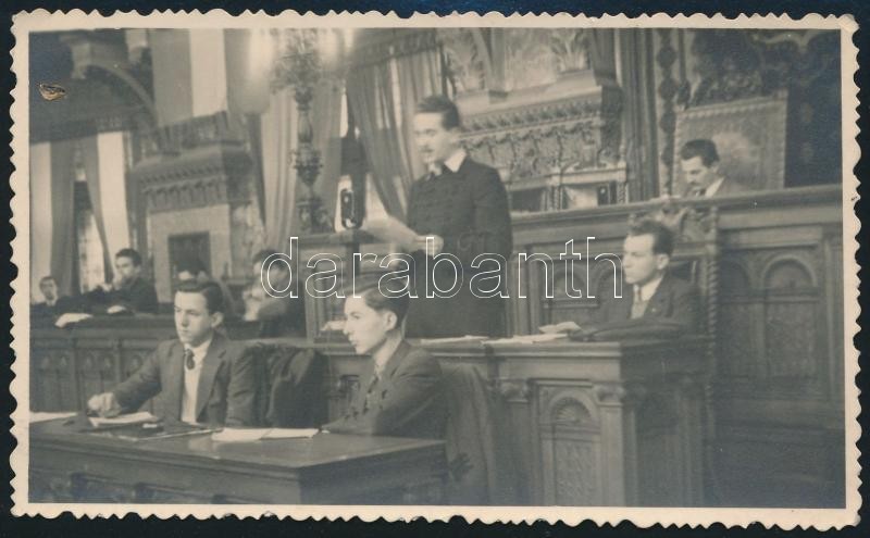 Leírás: cca 1930 Sipőcz Jenő Budapest főpolgármestere beszédet mond a Városházán a közgyűlés előtt. 13x8 cm