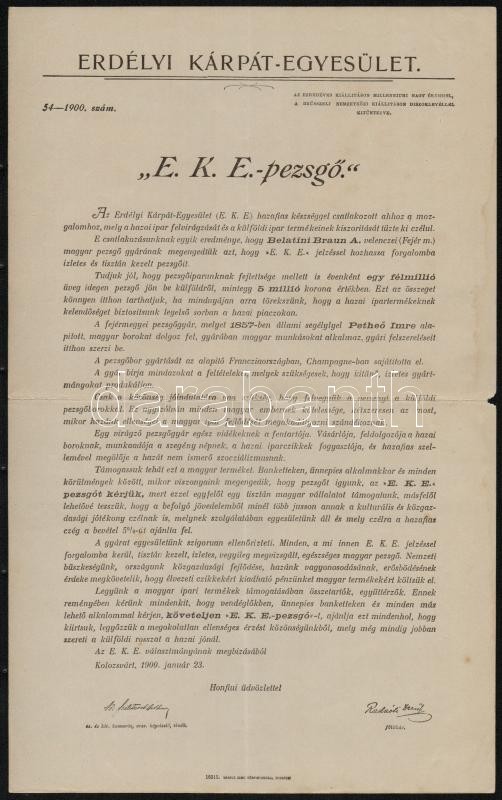 Leírás: 1900 Kolozsvár, Az Erdélyi Kárpát Egyesület felhívása pezsgőgyártás támogatására