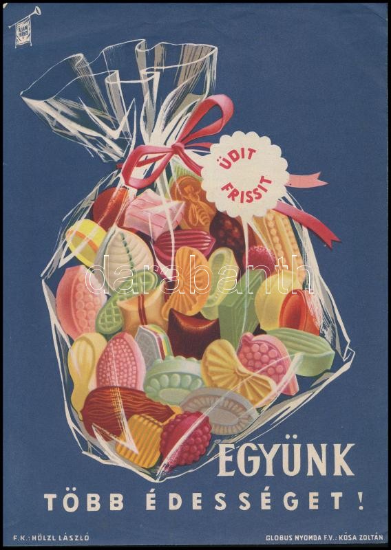 cca 1960 "Együnk több édességet!" - kisplakát, Globus Nyomda... https://www.darabanth.com/hu/329-Gyorsarveres/329.0/Festmeny-mutargy-papirregiseg-egyeb/Plakat~500031/cca-1960-Egyunk-tobb-edesseget-kisplakat-Globus-Nyomda-sarkan-kis-toresnyom-23-5C39717~II1833567