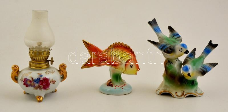 Leírás: 3 db, különféle jelzett porcelán dísztárgy. Madarak, petróleum lámpa 15 cm