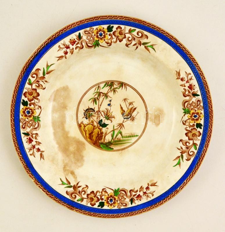 Leírás: Porcelán dísztányér, részben kézzel festett, jelzett, fém tartóval, d: 34,5 cm