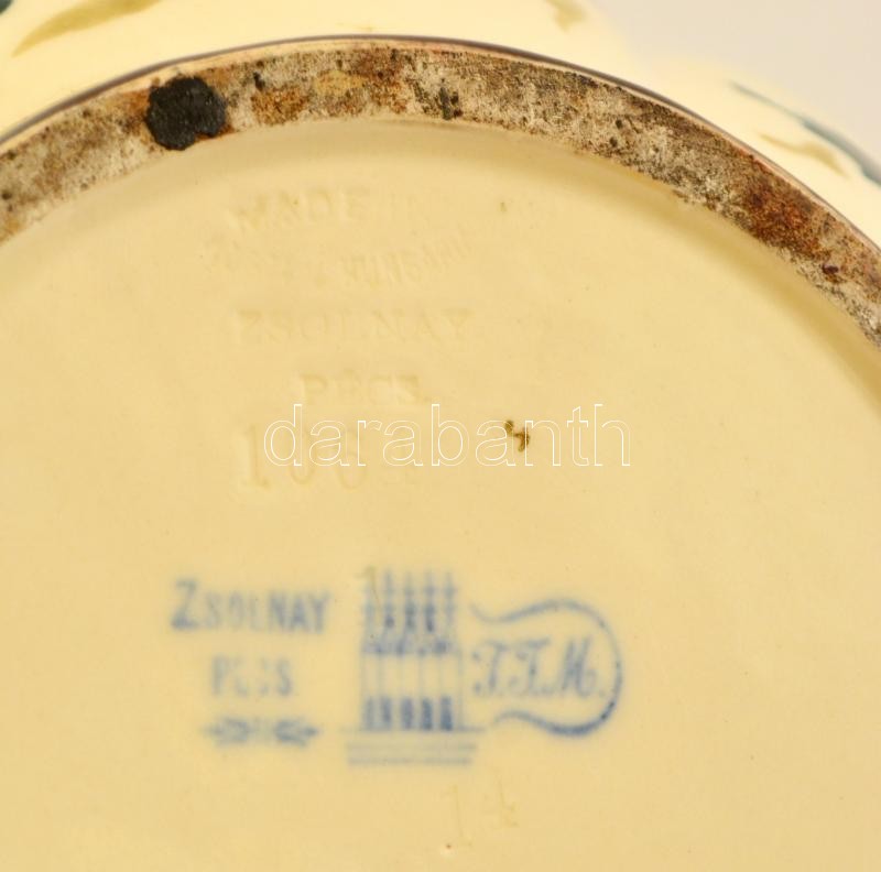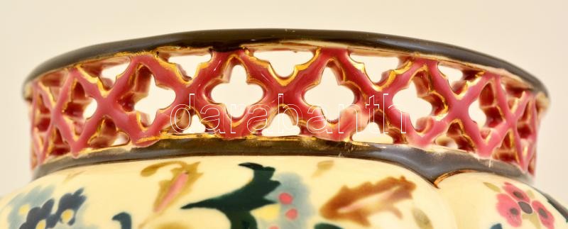 Zsolnay perzsa mintás áttört peremű kaspó, kézzel festett porcelánfajansz, jelzett (TJM), formaszám:1064, alján máz alatti hajszál repedéssel, m:15 cm, d:13,5 cm