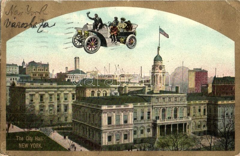 Leírás: New York City, The City Hall, automobile in the air montage. Th. E. L. Theochrom-Serie No. 105. (EK)