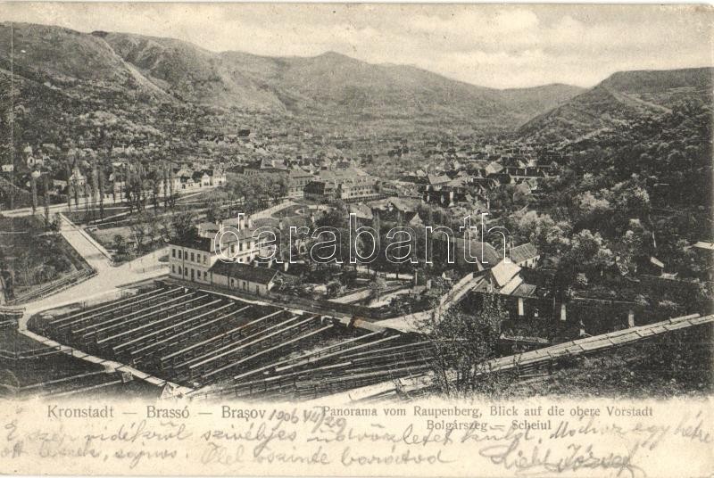 1906 Brassó, Kronstadt, Brasov; Panorama von Raupenberg. Blick auf die... https://www.darabanth.com/hu/329-Gyorsarveres/329.0/Kepeslapok/Erdely~2000006/1906-Brasso-Kronstadt-Brasov-Panorama-von-Raupenberg-Blick-auf-die-obere-Vorstadt-Bolgarszeg~II1837997
