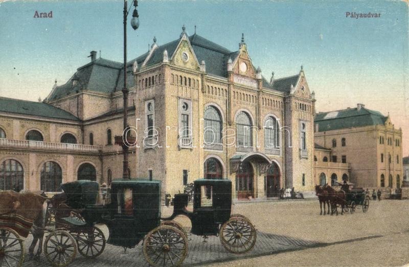 Leírás: Arad, Vasútállomás, pályaudvar, konflisok, lovaskocsik. Kiadja Kerpel Izsó / railway station, horse-drawn carriages