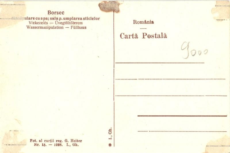 Borszék, Borsec; Manipulare cu apa, sala p. umplarea sticlelor / Vízkezelés, üvegtöltő terem, palackozás, belső munkásokkal. Kiadja G. Heiter Nr. 15. 1928. / Wassermanipulation, Füllhaus / water handling, bottle filling, interior with workers (ragasztónyom / glue marks)
