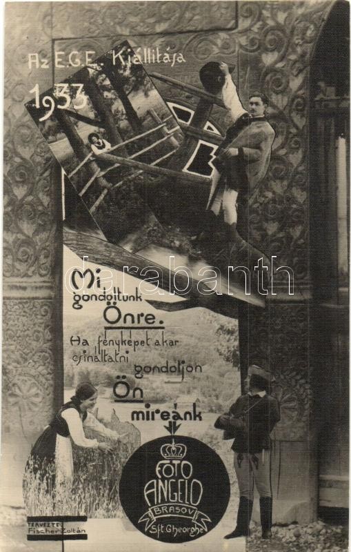 Brassó, Kronstadt, Brasov; az EGE (Erdélyi Gazdasági Egyesület) kiállítása 1933-ban. Mi gondoltunk Önre, ha fényképet akar csináltatni gondoljon Ön mireánk. Funk Pál Foto Angelo fényképészeti műterem reklámlapja, tervezte: Fischer Zoltán / Foto Angelo's photographic atelier and studio advertisement card