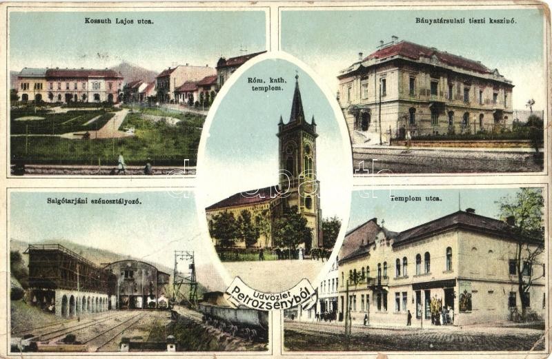 Petrozsény, Petrosani; Kossuth Lajos utca, Takarékpénztár, Bányatársulati tiszti kaszinó, Római katolikus templom, Salgótarjáni szénosztályozó, iparvasút, Templom utca, üzlet. Kiadja Muntyán Tivadar / street view, savings bank, officers' casino, church, coal mine, industrial railway, shops (fa)