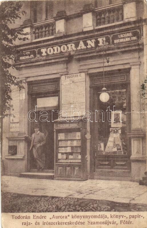 Szamosújvár, Gherla; Fő tér, Todorán Endre "Aurora" könyvnyomdája, papíros áruháza, üzlet kirakat. Todorán Endre saját kiadása / main square, shop front with owner, publishing house (fa)