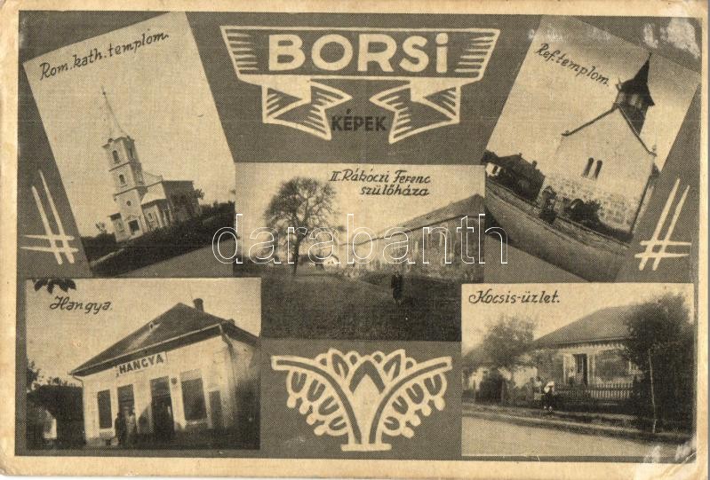 Borsi, Borsa; Római katolikus és református templom, Hangya és Kocsis üzlete, II. Rákóczi Ferenc szülőháza / churches, shops, birth house of Francis II Rákóczi (EK)