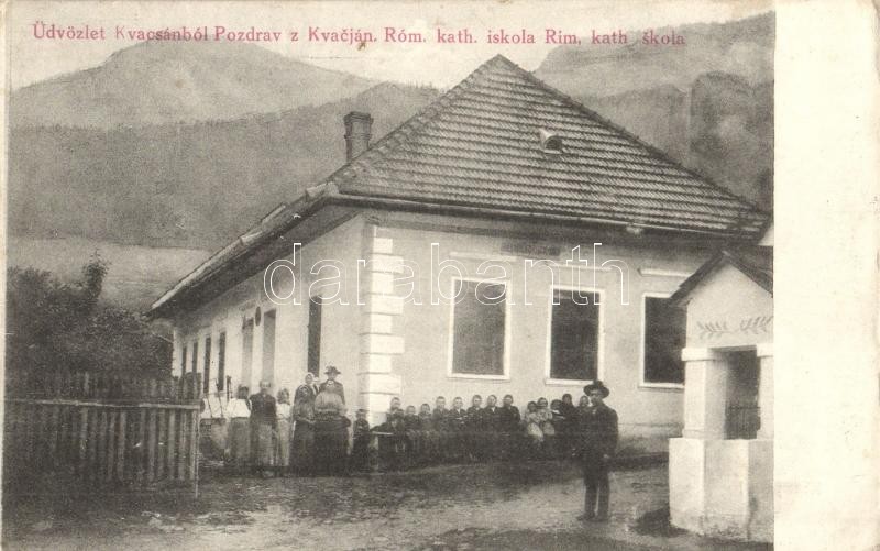 Leírás: Kvacsan, Kvacany; Rim. kath. skola / Római katolikus iskola, gyerekek. Kiadja a fogyasztási szövetkezet Kvacsán / Catholic school, children (EK)