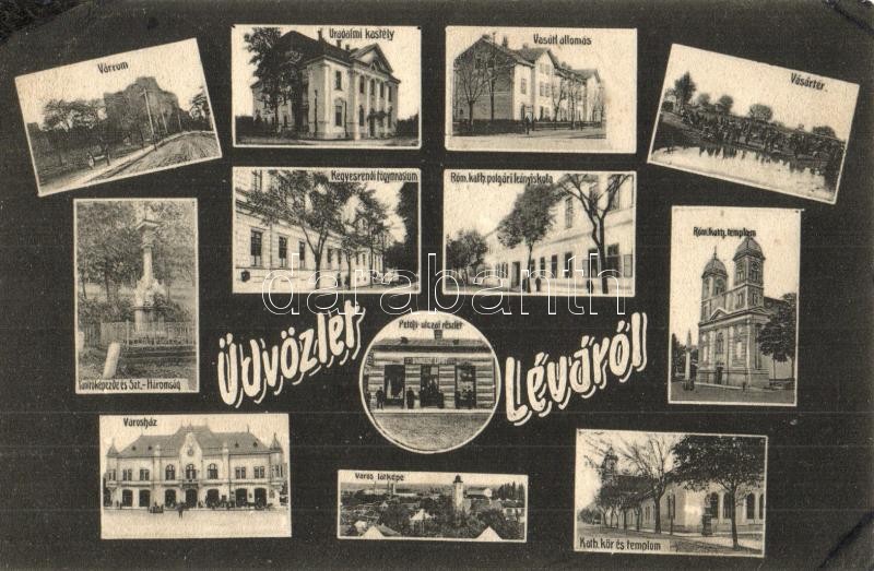 Léva, Levice; mozaiklap: várrom, uradalmi kastély, vasútállomás, vásártér, piac, tanítóképezde és Szentháromság szobor, Kegyesrendi főgimnázium, Római katolikus polgári leányiskola és templom, Petőfi utca Dukesz Lipót üzletével, Városháza. Dukesz Lipót saját kiadása / multi-view postcard: castle ruins, castle, railway station, market, school, Trinity statue, Catholic church and girl school, street view with publisher's shop, town hall (r)