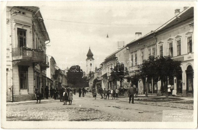Liptószentmiklós, Liptovsky Mikulas; Masaryková ulica / Masaryk utca, Római katolikus templom, Donáth üzlete / street view, Catholic church, shops (EK)