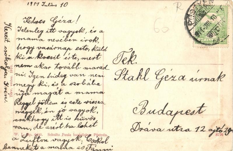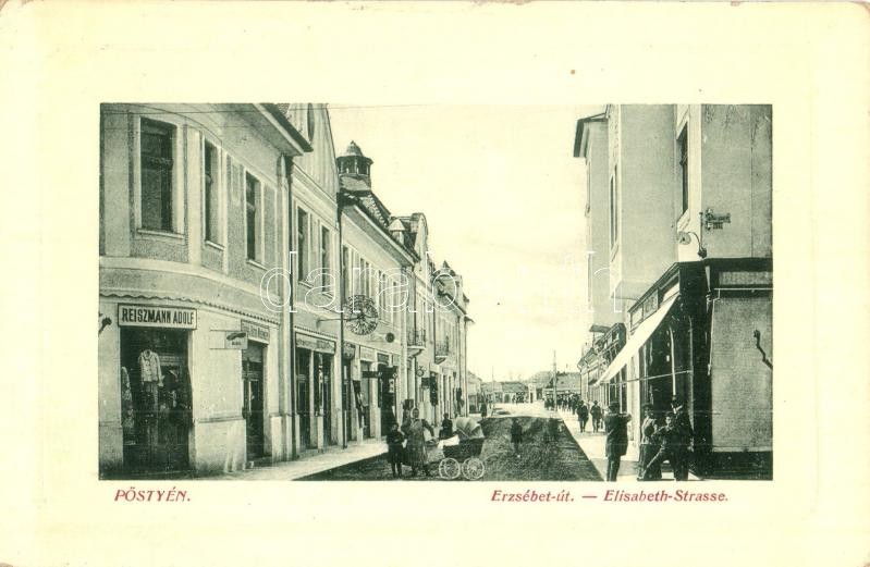 Pöstyén, Pistyan, Piestany; Erzsébet út, Reiszmann Adolf üzlete, babakocsi. W. L. Bp. 4400. Kiadja Schultz Paula / Elisabeth Strasse / street view, shops, pram (ázott sarok / wet corner)