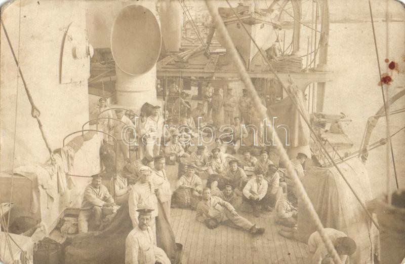 Leírás: 1916 SMS Kaiserin und Königin Maria Theresia (SMS Mária Terézia) Osztrák-Magyar Haditengerészet páncélos cirkálójának fedélzete pihenő matrózokkal, Popeszku György matróz zsákja / WWI Austro-Hungarian Navy K.u.K. Kriegsmarine armored cruiser's deck with resting mariners. photo + SMS Kaiserin und Königin Maria Theresia Marinefeldpost (fa)