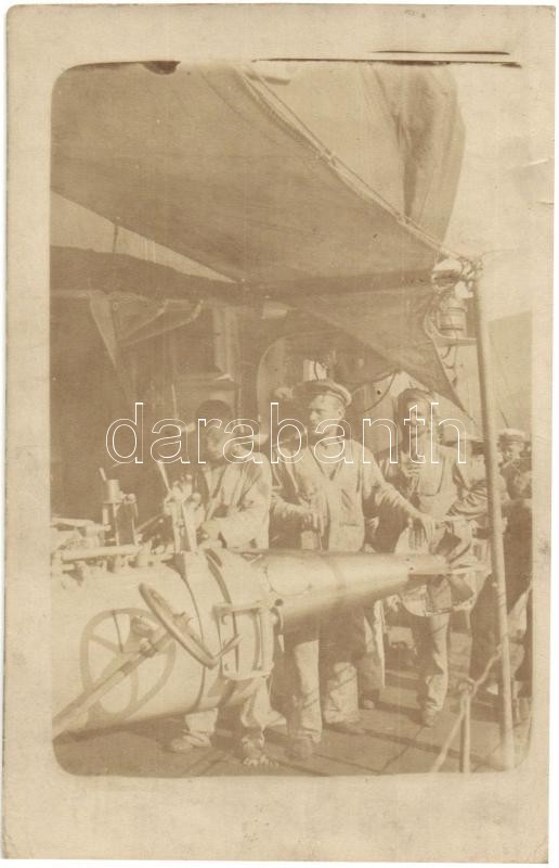 Leírás: 1917 SMS Gäa/Gaea (ex SS Fürst Bismarck) torpedó anyahajó fedélzete matrózokkal és torpedóvetővel / WWI Austro-Hungarian Navy K.u.K. Kriegsmarine torpedo depot ship's deck with mariners and torpedo launcher. photo + SMS Gäa Marinefeldpost (EK)