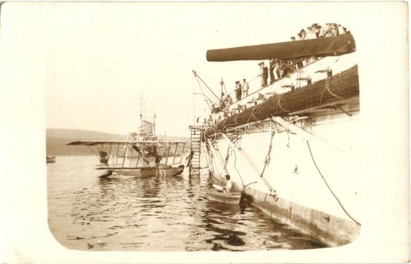 Leírás: Osztrák-Magyar Haditengerészet Lochner "L53" lajstromjelű hidroplánja az SMS Tegetthoff csatahajó mellett, matrózok / K.u.K. Kriegsmarine Seeflugzeug / WWI Austro-Hungarian Navy's Lochner L53 seaplane next to SMS Tegetthoff dreadnought battleship, mariners. photo (EK)