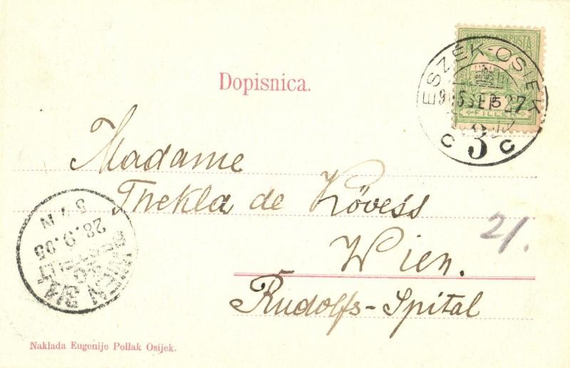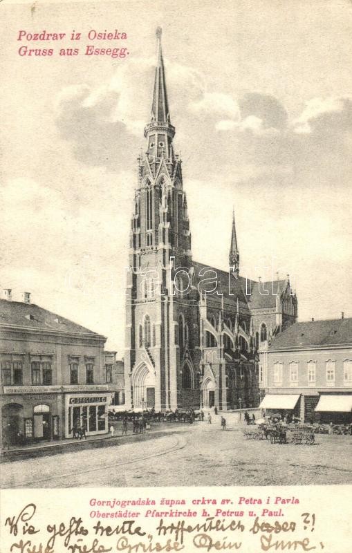 1905 Eszék, Esseg, Osijek; Felsővárosi Péter és Pál templom, drogéria, Első Magyar-Német Eszéki üzlet / Gornjogradska zupna crkva sv. Petra i Pavla / square with church, drogerie and shops