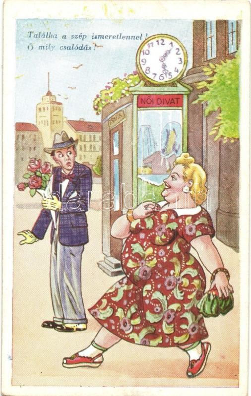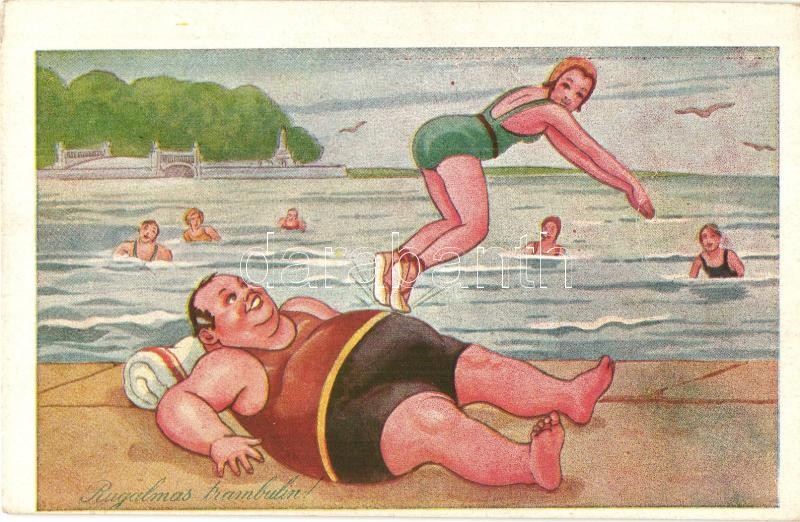 "Rugalmas trambulin" "Mint kotló a csirkére" "Találka a szép ismeretlennel" 3 db RÉGI használatlan humoros képeslap / Fat man at the beach, fat lady on the streets - 3 pre-1945 unused humorous postcards